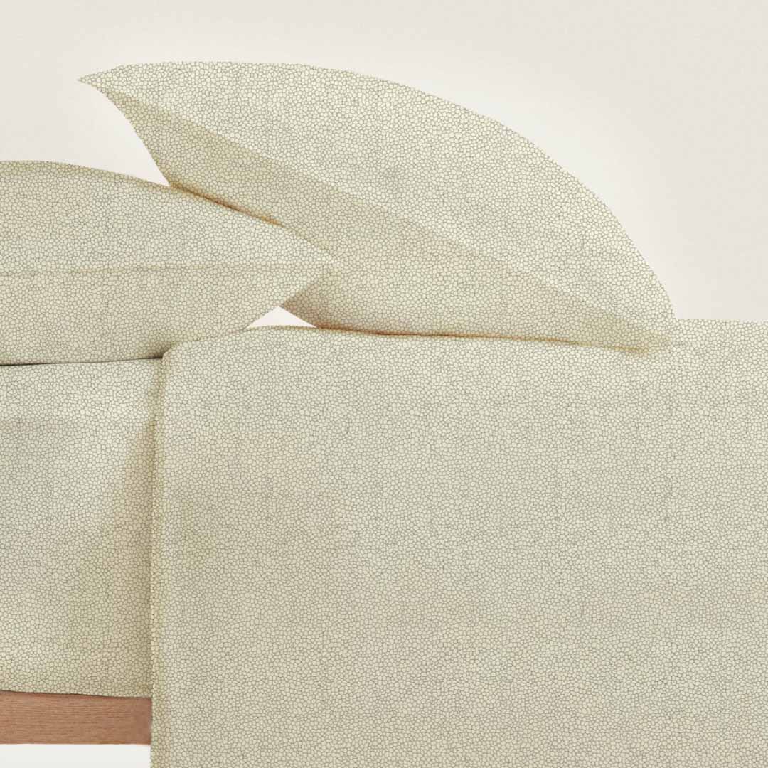 Completo lenzuola copriletto BLOT 100% cotone in fibra naturale. Il suo motivo effetto borbonese dona un tocco di semplicità ed eleganza alla stanza.