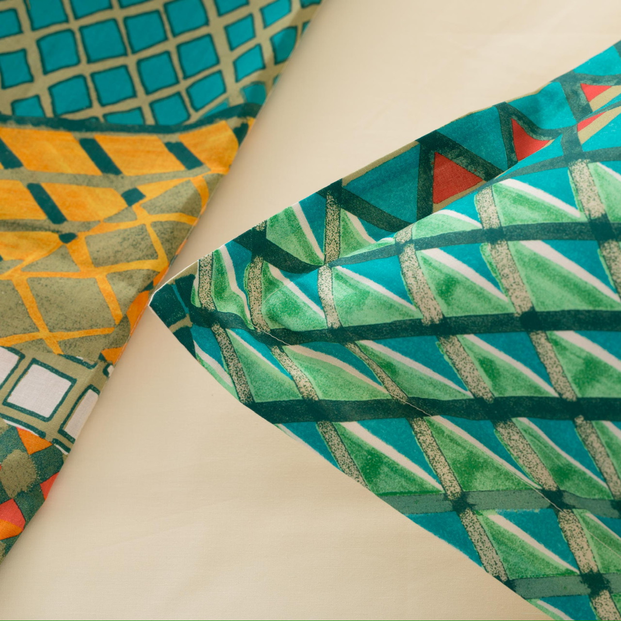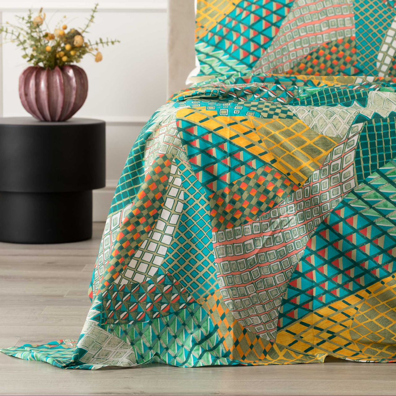 Completo lenzuolo copriletto matrimoniale VALMA firmato RIVIERA, realizzato in morbido percalle 100% cotone con stampa digitale che crea un patchwork di geometrie minute, rombi, losanghe e intrecci disegnati con minuzia, ispirati alle trame delle stuoie e ai dettagli delle lavorazioni artigianali.