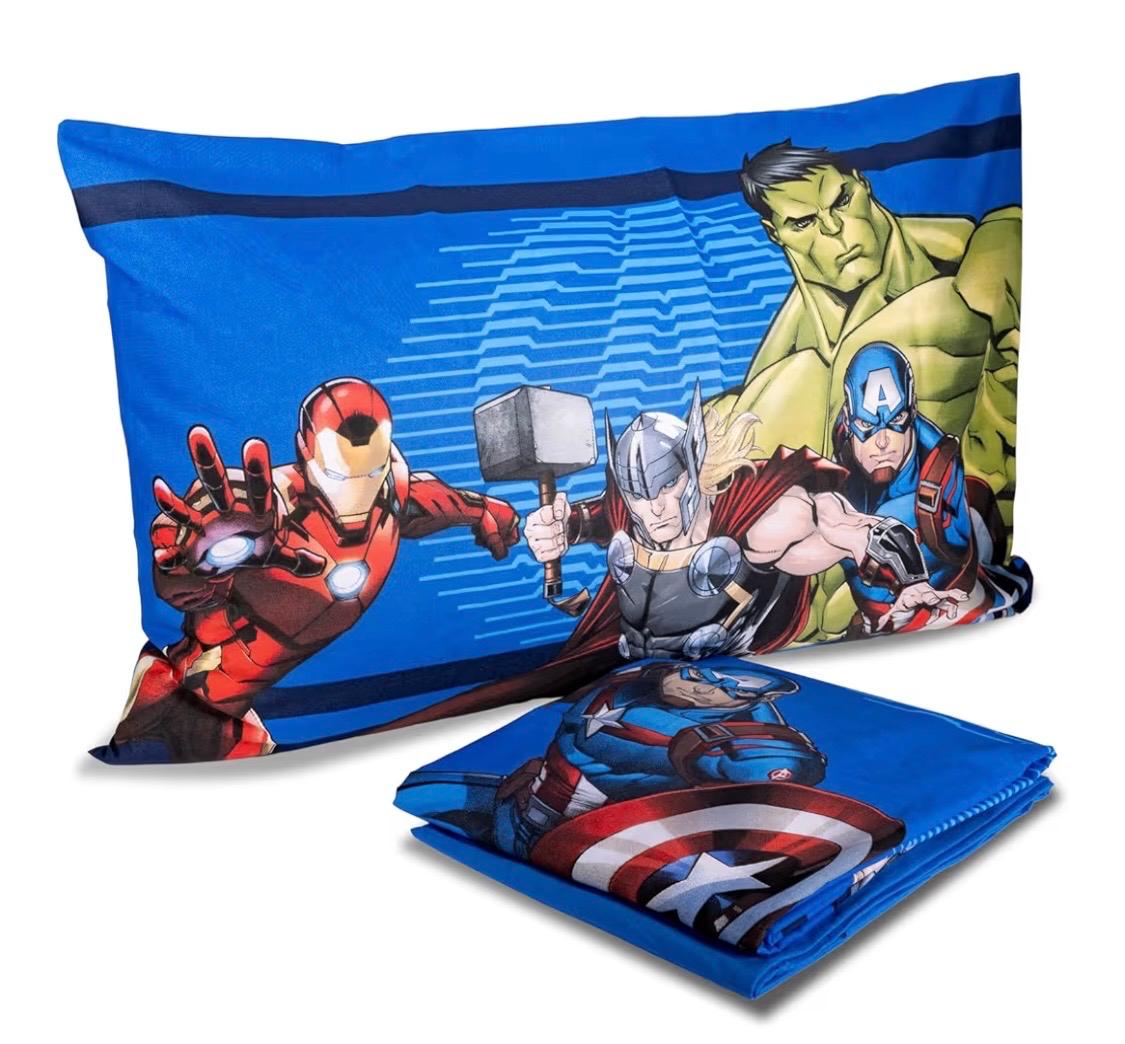 Completo lenzuola singolo AVENGERS, realizzato in morbido cotone, è progettato per aggiungere un tocco di divertimento e magia a una camera da letto, in particolare per i bambini o per chi è un appassionato dei personaggi Marvel