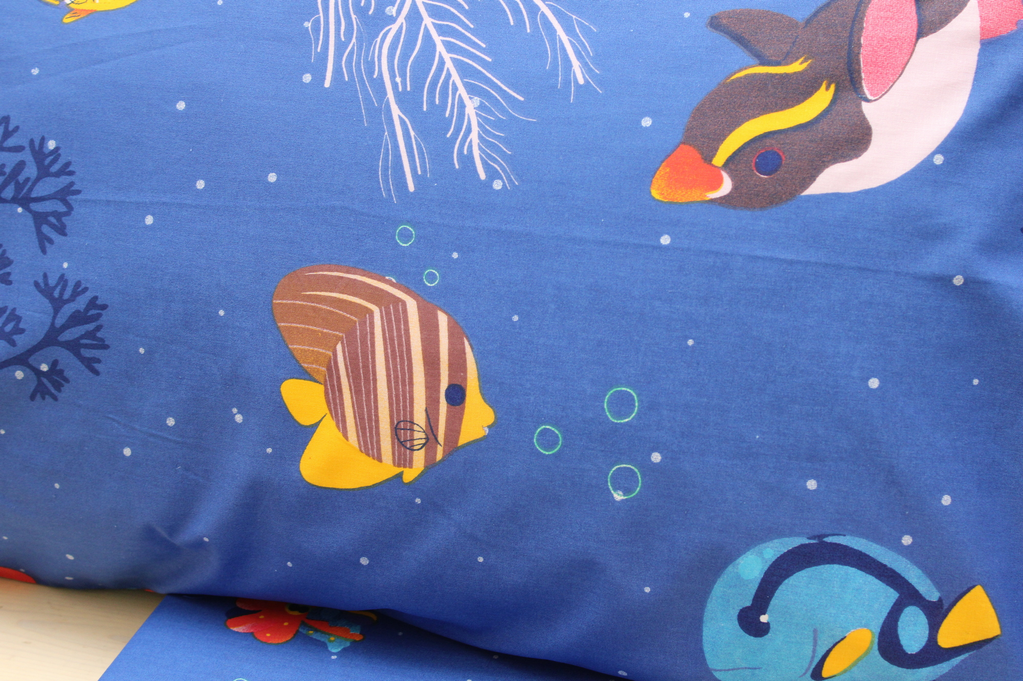 Completo lenzuola singolo fantasia marina, realizzato in morbido 100% cotone.