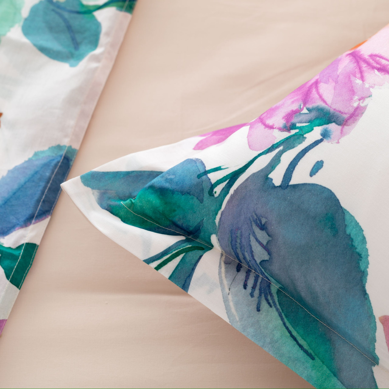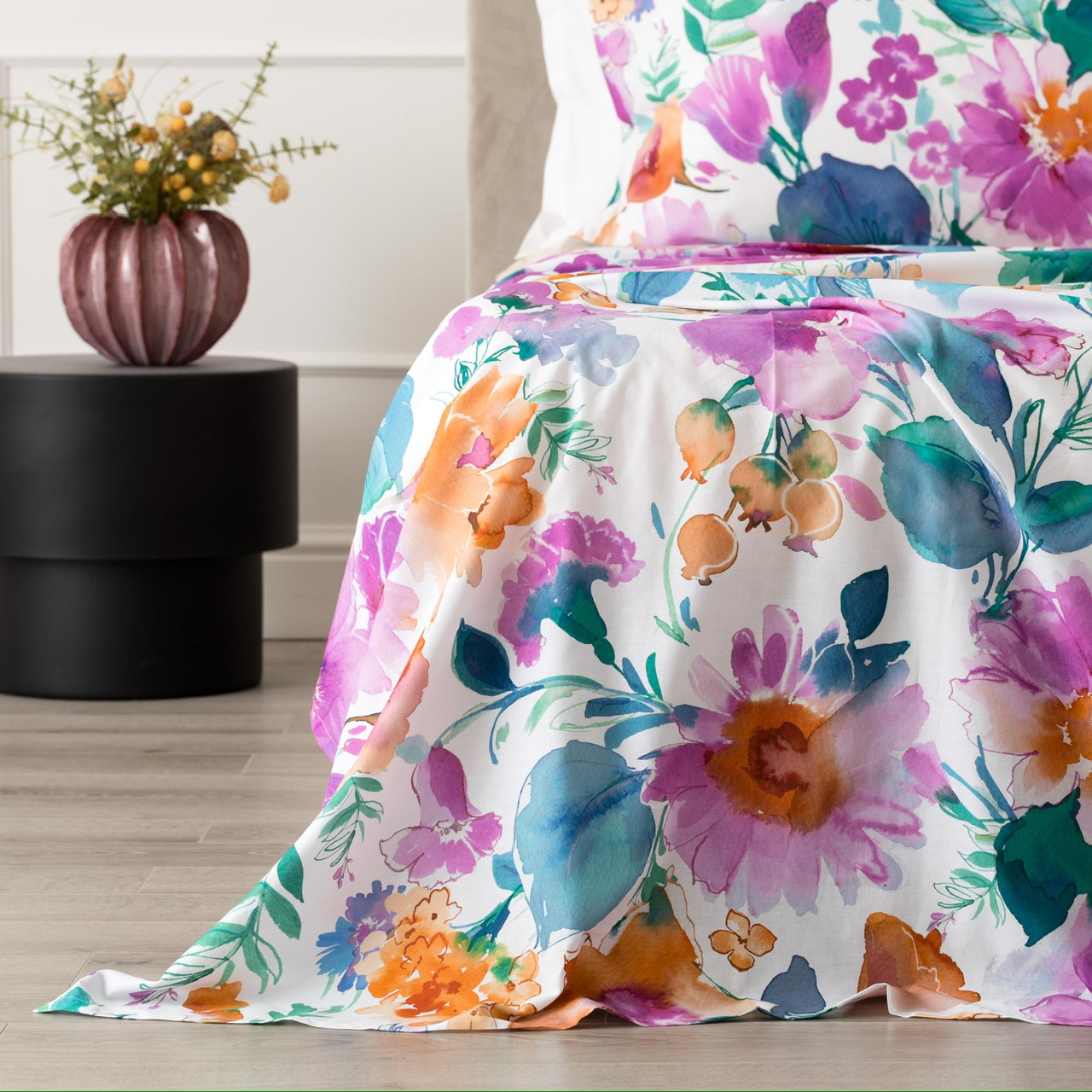 Completo lenzuolo copriletto matrimoniale MELIKA firmato RIVIERA, realizzato in morbido percalle 100% cotone con stampa digitale floreale.