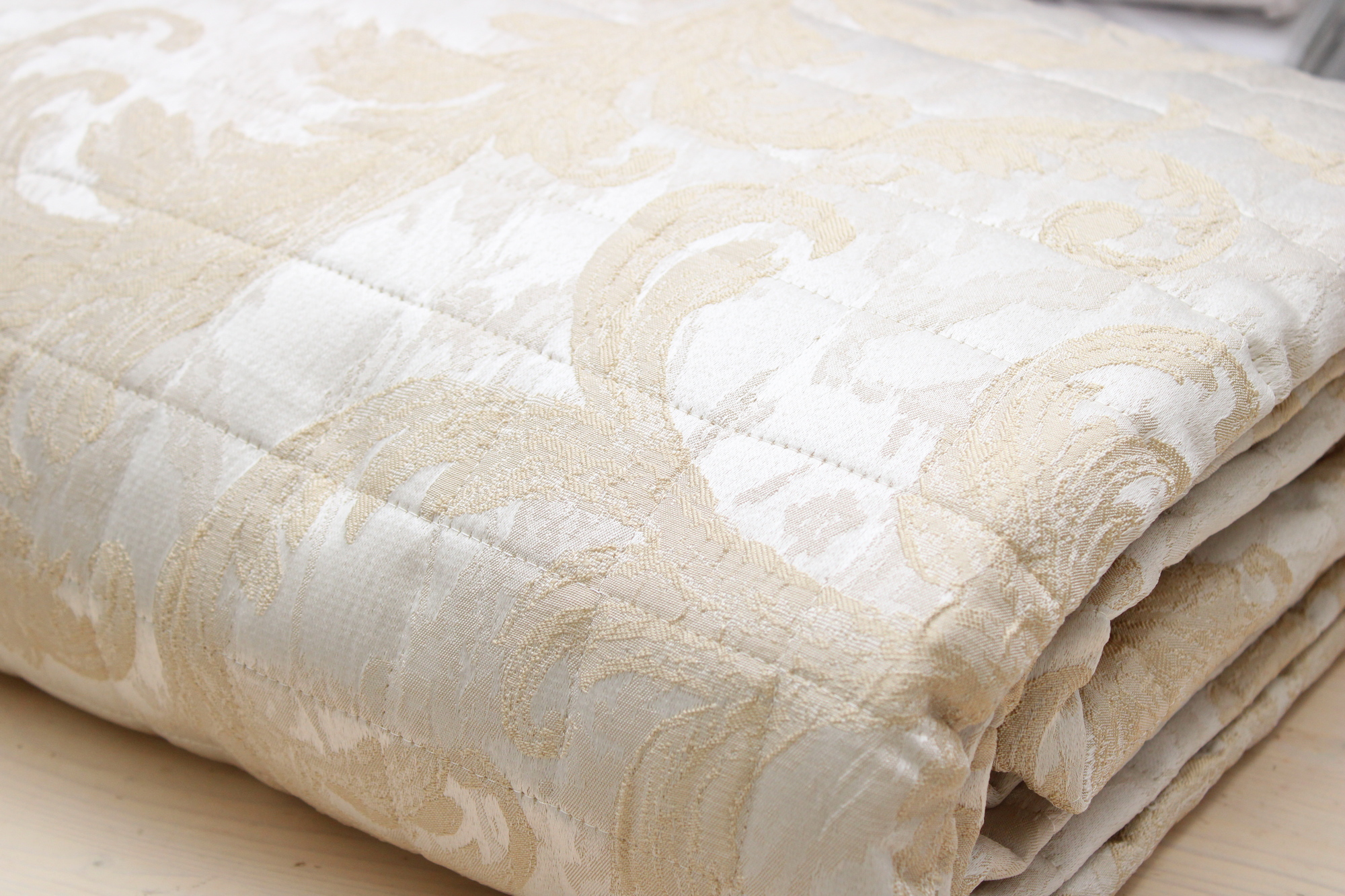 Trapuntino jacquard DAMA effetto raso con fantasia damascata, elegante e di qualità, perfetto per dare stile e raffinatezza alla tua camera. Trapuntatura a quadri, 260x260.