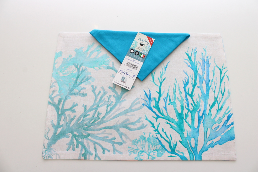 Info sui prodotti "TOVAGLIETTA ALL'AMERICANA CON TOVAGLIOLO FANTASIA MARINA CORALLI DALEY BLU"