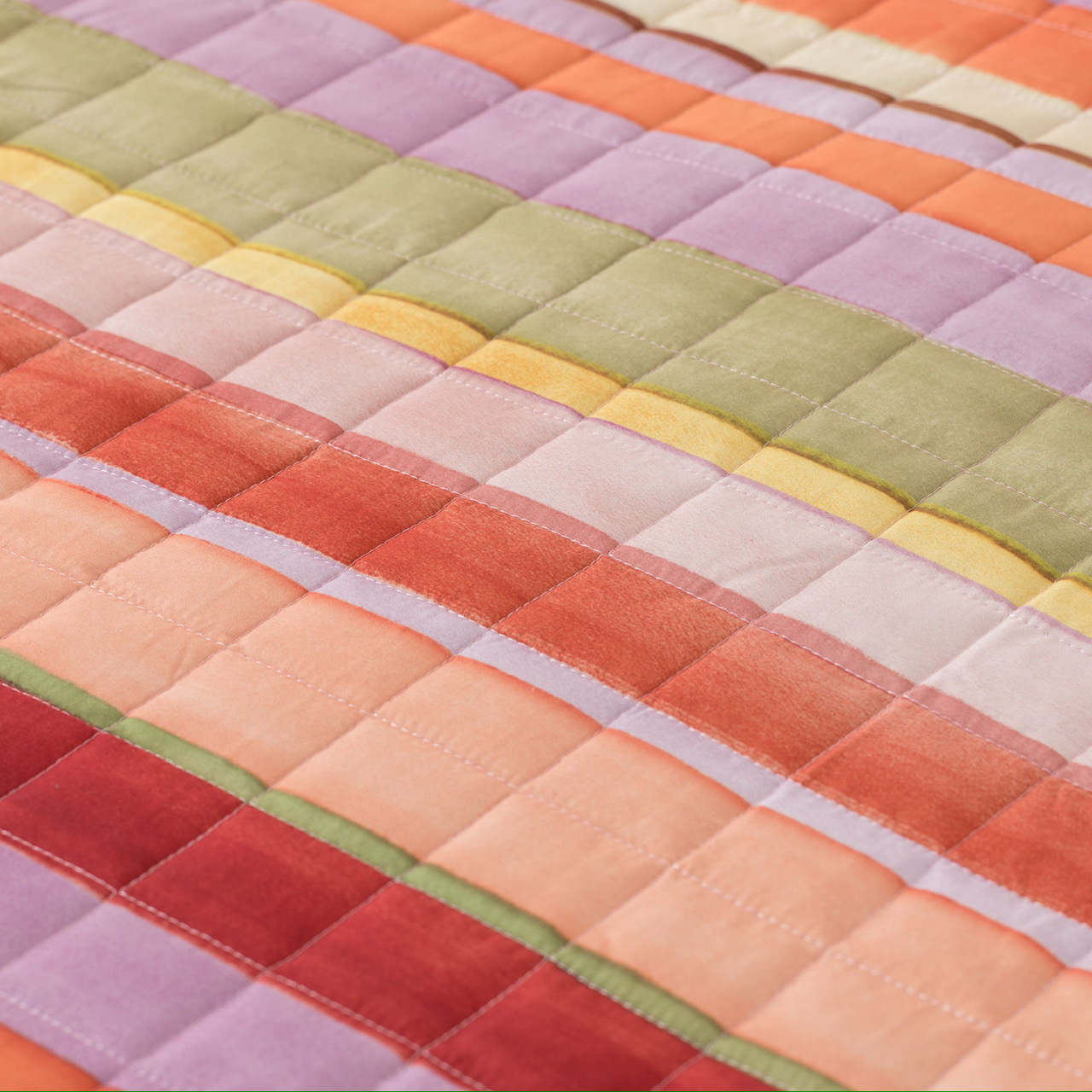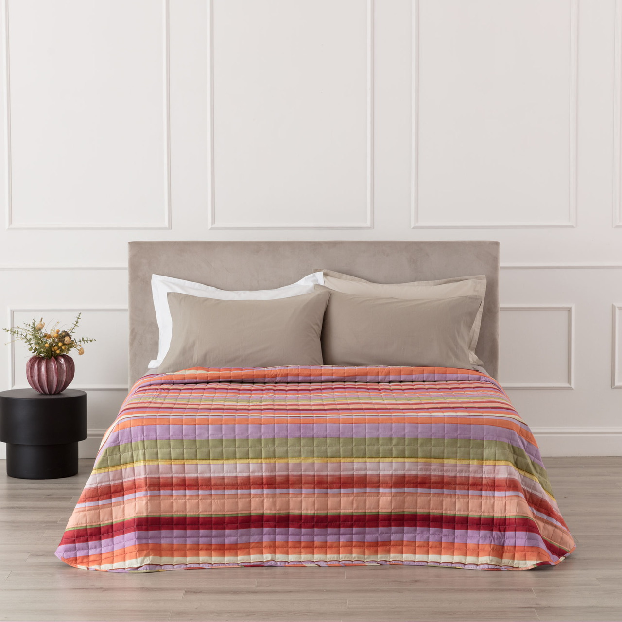 Trapuntino MARTA firmato RIVIERA con fantasia a righe multicolor, è realizzato sul fronte in microfibra 100% poliestere stampata, con retro in microfibra tinta unita coordinata. Imbottitura in poliestere da 120 gsm, trapuntatura a quadri da 5 cm con angoli tondi, 170x260.